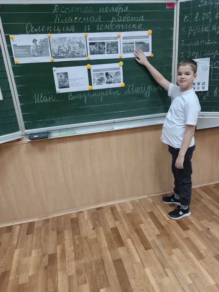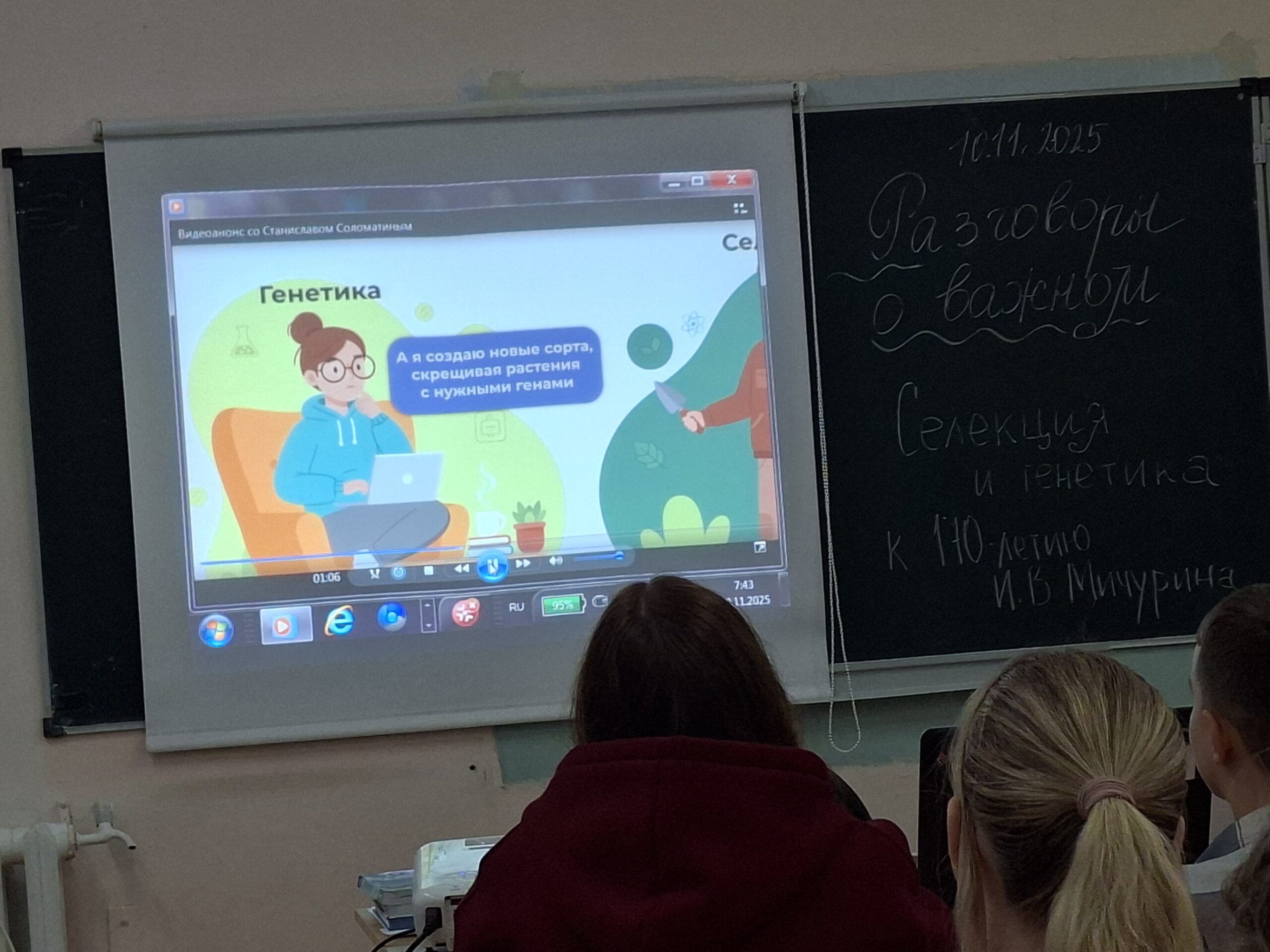 10 ноября тема «Разговоров о важном» — «Селекция и генетика. К 170-летию И.В. Мичурина». Ребята узнали, что генетика и селекция — это науки, которые помогают улучшать жизнь человека: создаются новые сорта растений, устойчивых к болезням, повышается урожайность, развивается продовольственная безопасность страны. Особое внимание уделили личности Ивана Владимировича Мичурина — выдающегося российского учёного, селекционера, чьи открытия навсегда изменили аграрную науку. Он вывел сотни новых сортов фруктов и доказал, что человек может разумно управлять природой, не нарушая её гармонию. В ходе беседы школьники обсуждали, как современные технологии — от генной инженерии до искусственного интеллекта — помогают учёным создавать новые возможности для сельского хозяйства. Главная мысль занятия — развитие науки невозможно без уважения к природе и ответственного отношения к её богатствам.